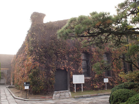 朝もやにつつまれた蔦のからまるアイビースクェア
